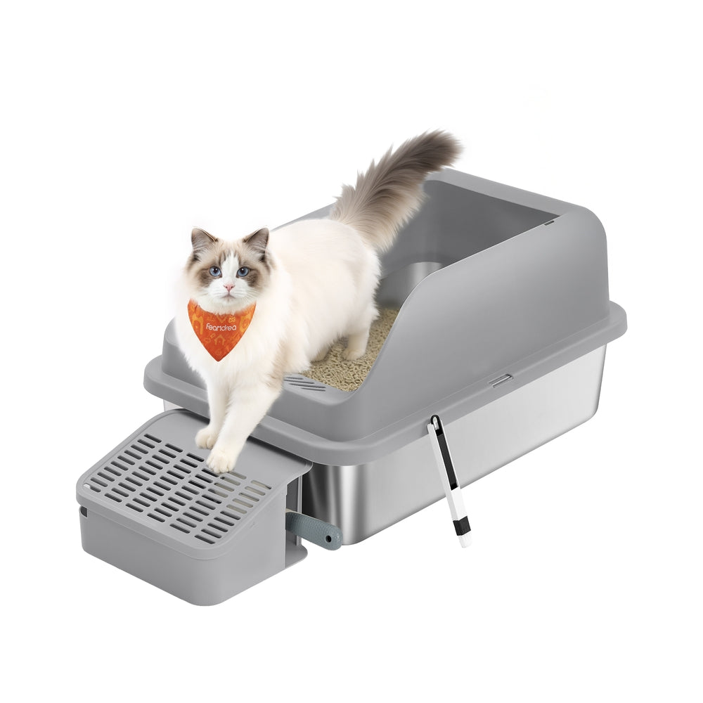 Lettiera per gatti in acciaio inox con ingresso superiore