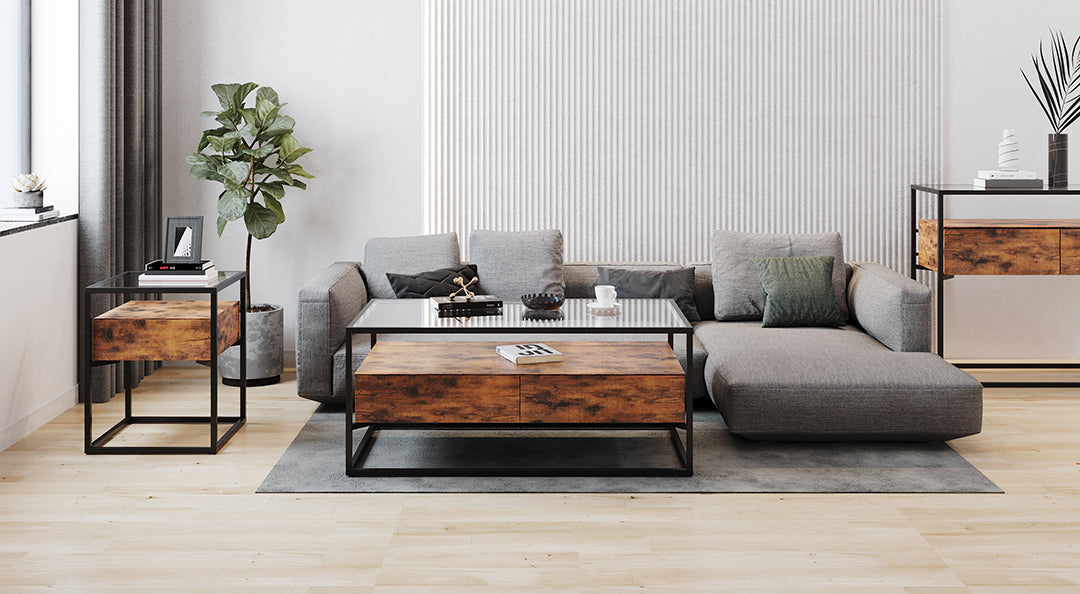 Accosta vari pezzi d'arredo che combinano questi 3 materiali in un unico design,