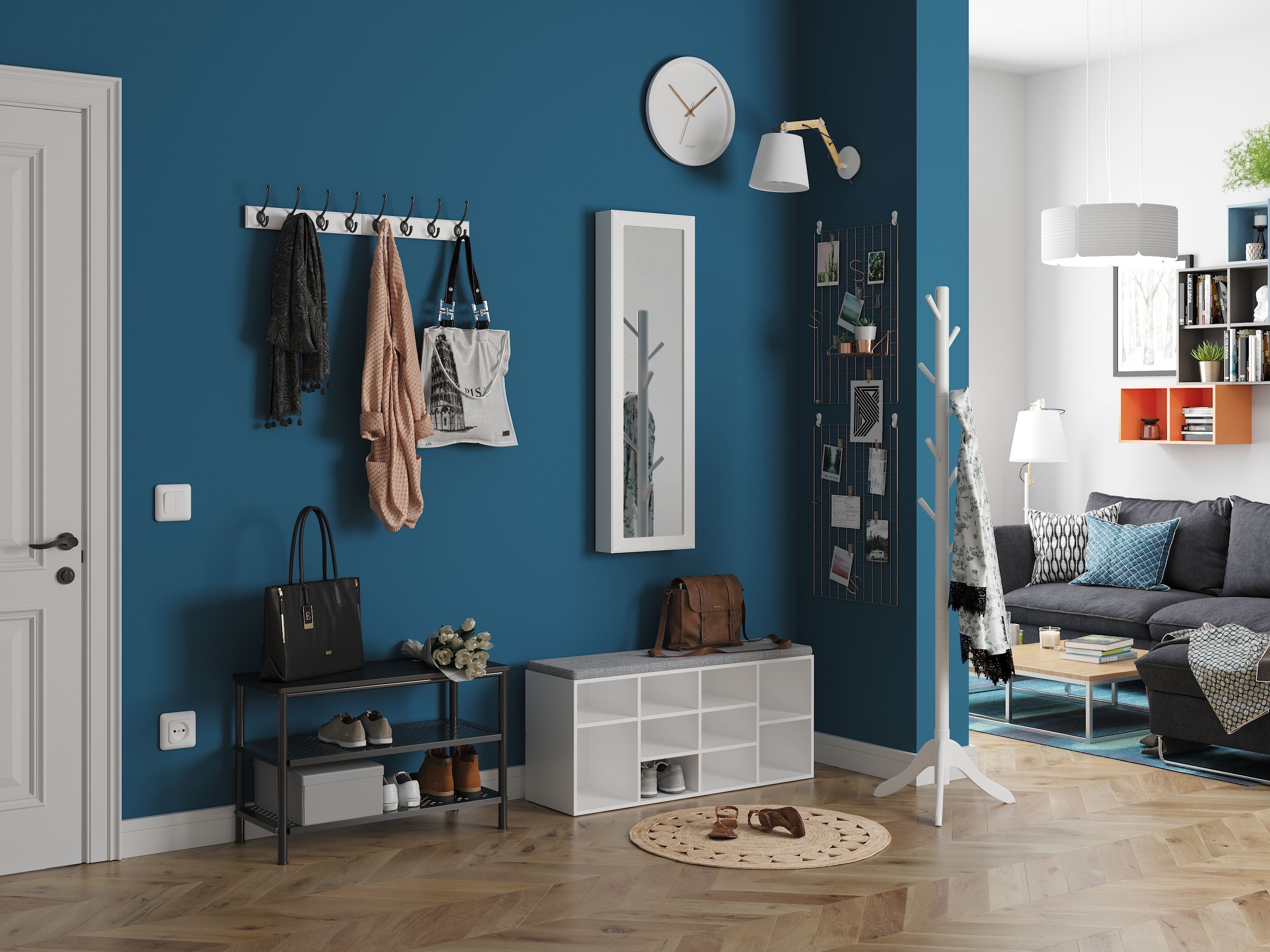 Una parete blu nell'ingresso, abbinata a diversi semplici pezzi,